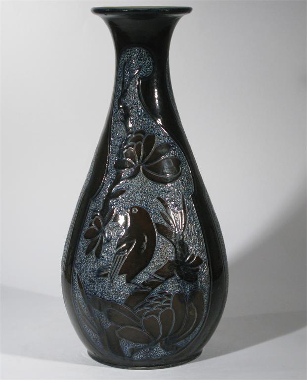 A tall C H Brannam pottery vase by James Dewdney, incised with panels of birds perched on flowering boughs, in brown on a mottled blue ground incised marks, JD monogram dated 1899, restored neck rim 47cm. high