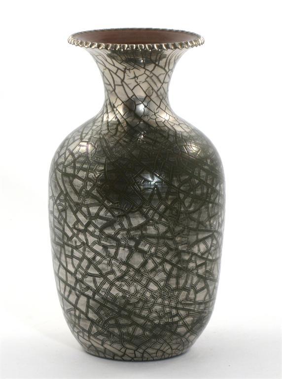 A Sunflower Pottery vase designed by Sir Edmund Elton, shouldered form, covered in a crackled platinum glaze painted Elton 20cm. high