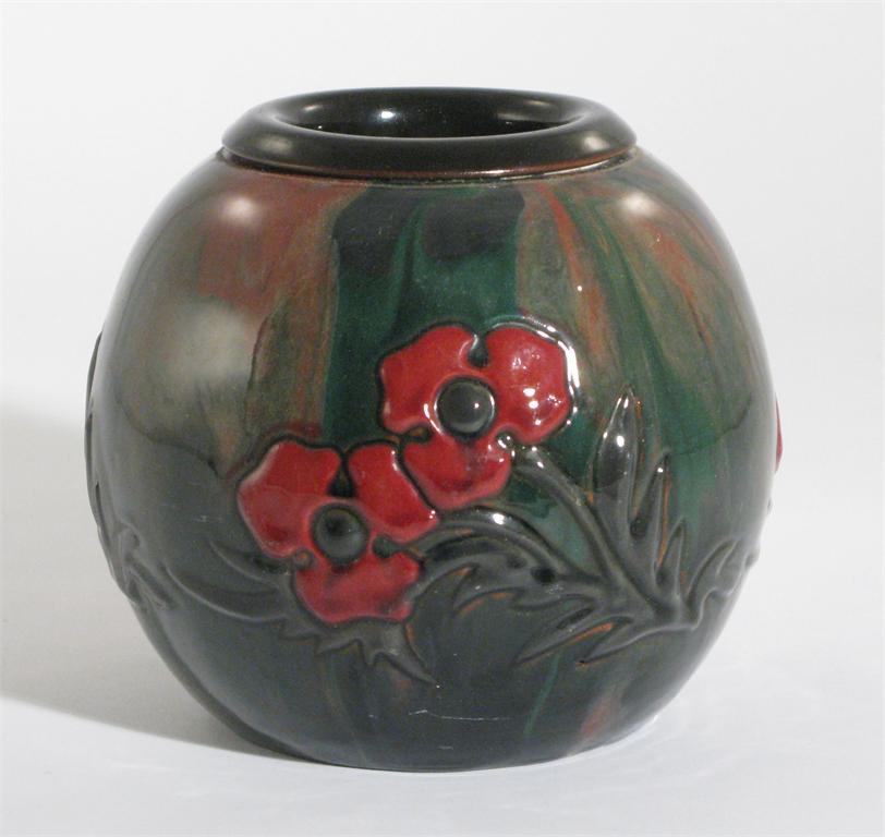 A Sunflower Pottery vase/candlestick, by Sir Edmund Elton ovoid, decorated in low relief with flowers in pink and green on a running green and pink ground unsigned, 14cm. high