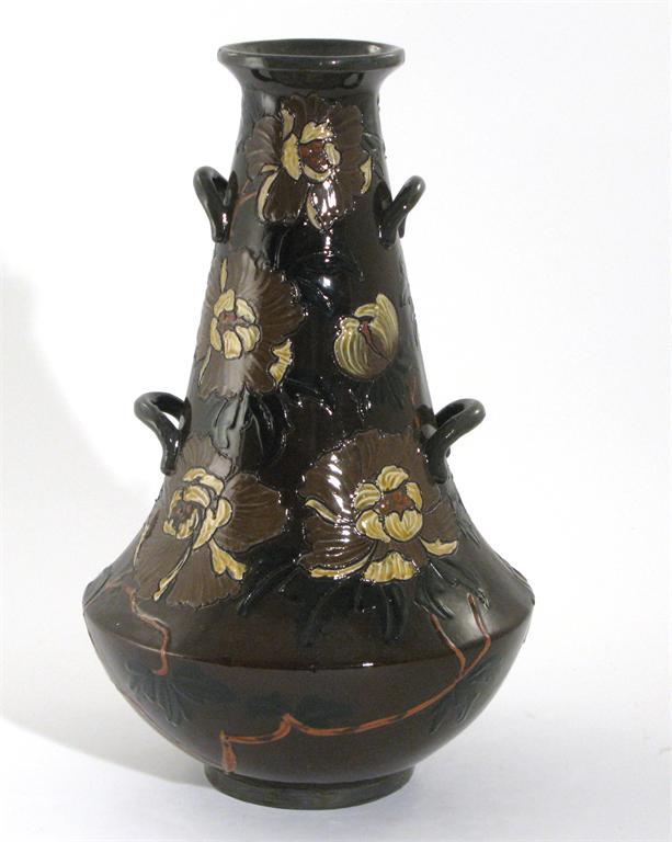 An unusual Foley Faience vase tapering form with four applied handles, impasto decorated with flowers in shades of green, brown and white on a brown ground printed factory mark 40cm. high