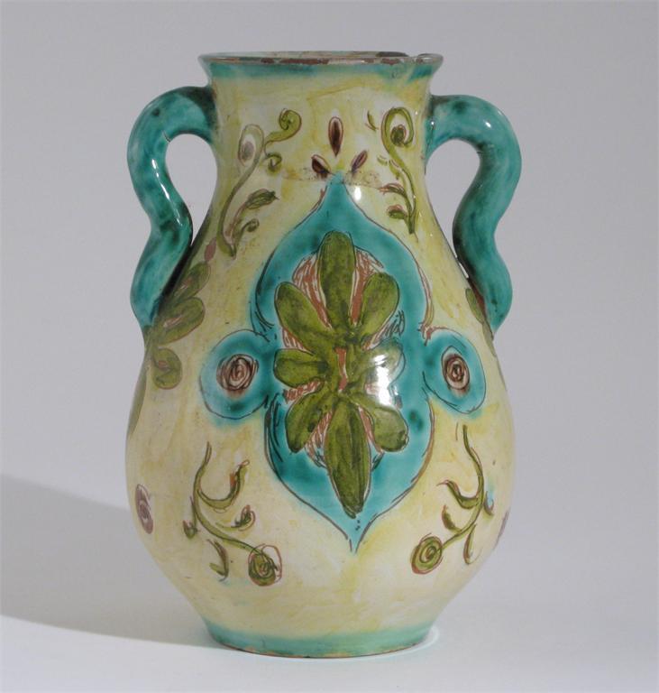 A Della Robbia Pottery twin-handled vase by Hannah Jones, painted with foliate panels in shades of green and turquoise on a pale yellow ground painted marks, HJ monogram, repair to top rim 23.5cm. high