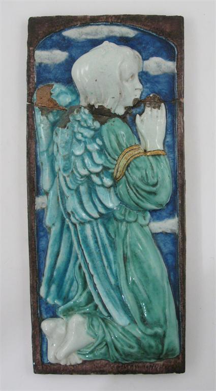 A Della Robbia stoneware plaque by Conrad Dressler, rectangular, cast in relief with a praying angel, glazed in colours impressed marks, painted marks to reverse, dated 1904, damages 54 x 24cm.