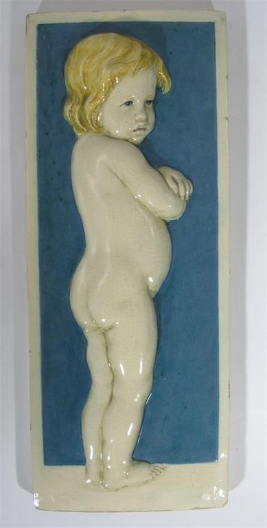 A Della Pottery plaque by Marianne de Caluwe, cast in low relief with a young boy, glazed in yellow and blue on a white ground painted D & R, M de C, minor glaze chips 44 x 17.5cm