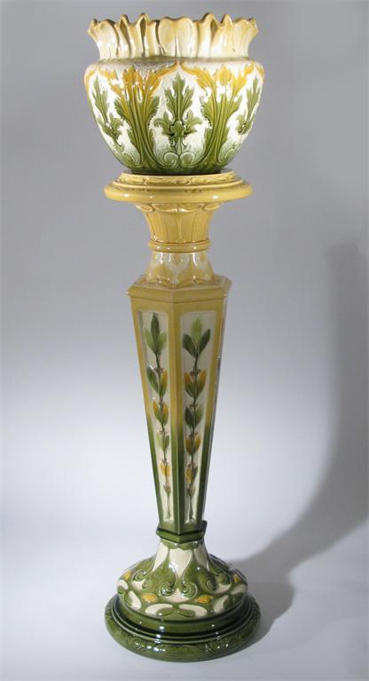 A Leeds Art Pottery jardiniere and stand model no.306, modelled in low relief with stiff-leaf foliage, glazed in shades of yellow, cream and green impressed marks, 111cm. high
