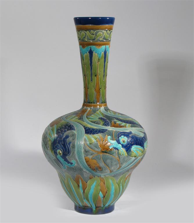 A large Burmantoft's Faience Anglo Persian vase model no.2123, decorated with classical dolphin in shades of blue, green and turquoise, between borders of stylised foliage impressed marks, repaired neck 54 cm. high