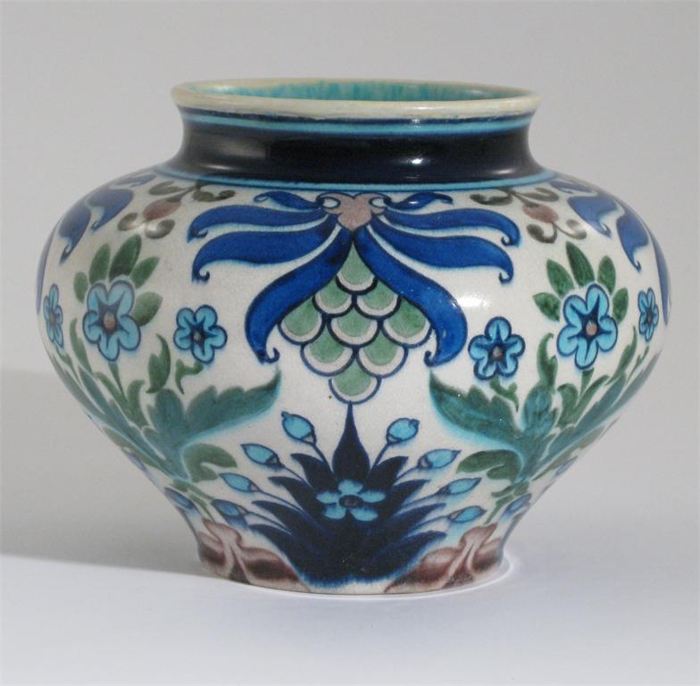 A Burmantoft's Faience Anglo Persian vase by Leonard King, pattern D.279, compressed form, painted with stylised flowers and foliage, in blue, aubergine and green on a white ground impressed marks, painted marks, star crack and some restoration to top rim 18cm. high