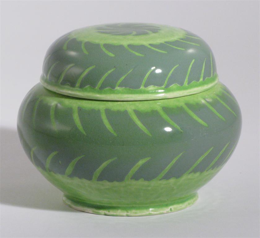 A Gustafsberg pottery ginger jar and cover dated 1905, resist decorated with foliate design on a lime green ground painted marks, 11cm. high