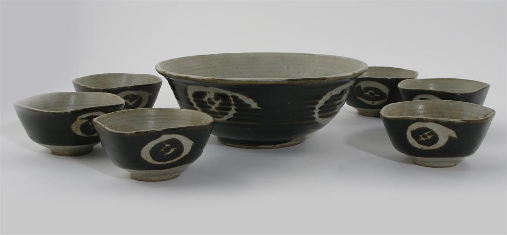 a stoneware dessert set, resist decorated in tenmoku over dolomite, comprising six side bowls and a serving bowl impressed seal marks 27cm. diam.