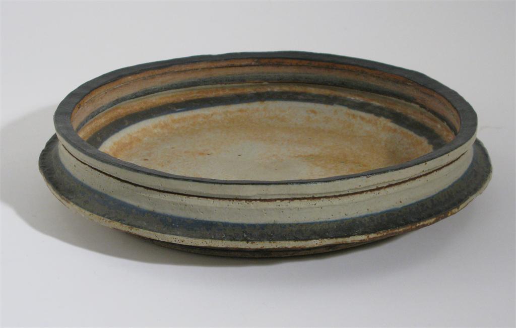 Robin Welch (born 1936) a low flat stoneware bowl, glazed in blue and off white painted signature 35cm. diam.