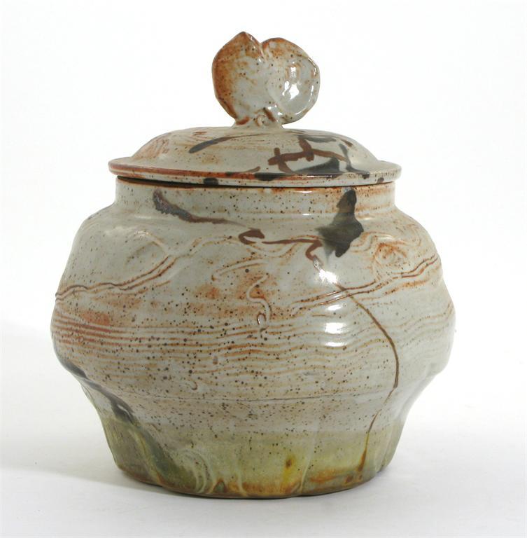 John Glick (born 1938) a stoneware vase and cover, ovoid, incised decoration, glazed oatmeal, the cover with carved fish finial impressed seal mark, paper label 26cm. high