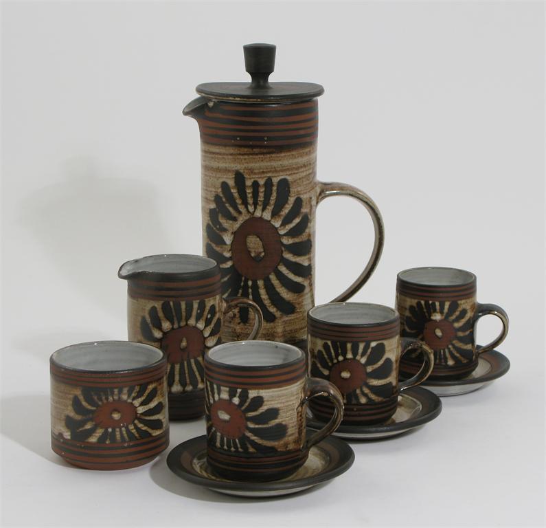 Briglin Pottery a terracotta coffee set, painted with a splash flowerhead design, comprising; coffee pot and cover, milk and sugar basin, six cans and saucers impressed Briglin 22cm. high