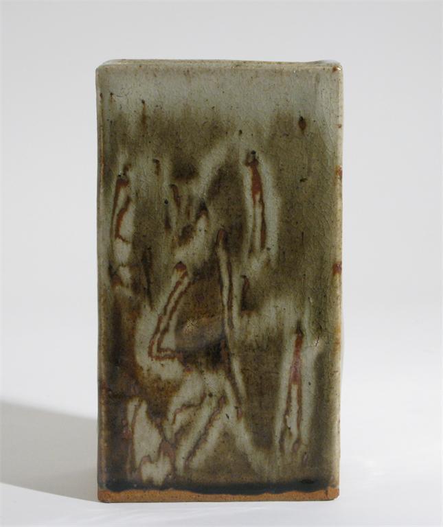 Marianne De Trey (b.1913) a slab built vase, Shinners Bridge Pottery, rectangular section, glazed in celadon and rust impressed Scallop seal mark 20.5cm. high