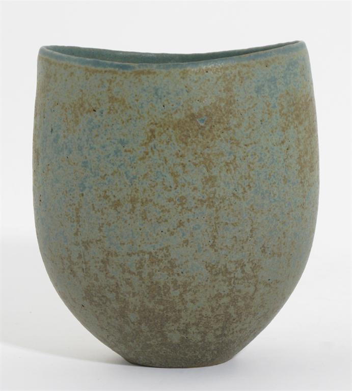 John Ward (born 1938) an earthenware vase, elliptical form, covered in a mottled blue glaze impressed JW seal 17cm. high
