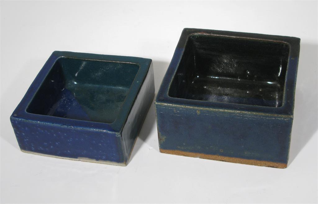 Ian Auld (1926-2000) a square dish, glazed in blue and green with a geometric design, and another Ian Auld dish glazed blue and black impressed seal mark to both 14cm. square