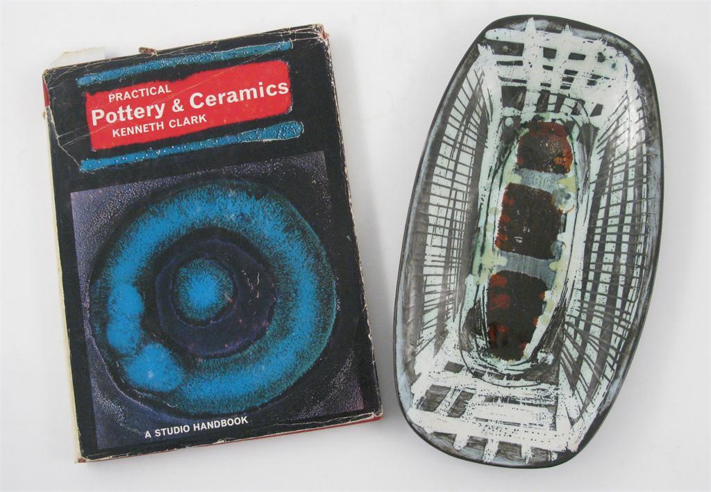 a swollen rectangular dish, wax resist decorated with geometric design, and a copy of Practical Pottery & Ceramics by Kenneth Clark dish unsigned 28.5cm. wide