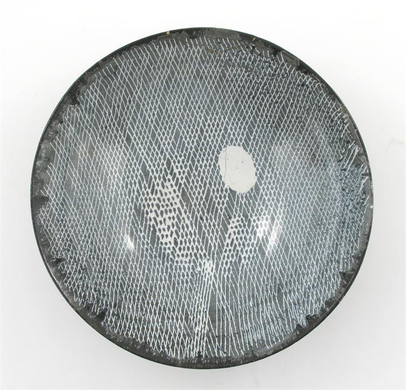 a flaring bowl, the interior resist decorated, the exterior glazed black impressed marks, repaired rim 37cm. diam.