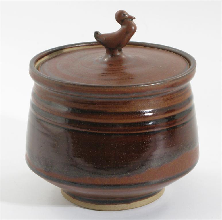 Robert Fournier (b. 1915) a stoneware vase and cover, the cover with applied bird finial, glazed tenmoku impressed seal mark 19.5cm. high