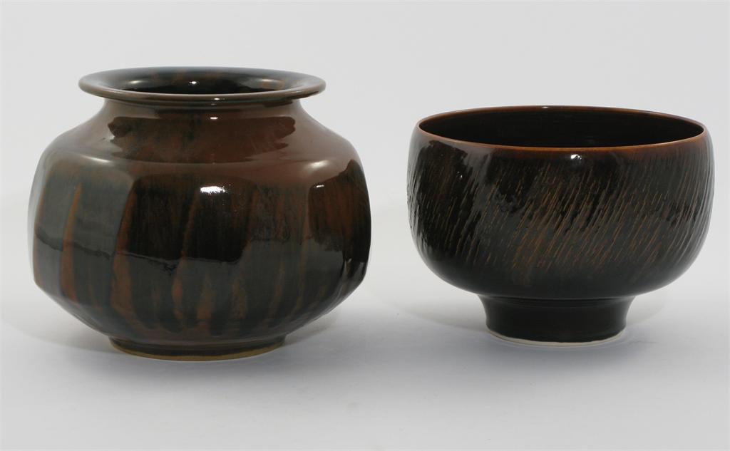 Chris Carter (b.1945) a cut sided vase, with everted rim, covered in a mottled brown glaze, and a bowl similar impressed marks 19.5cm. high