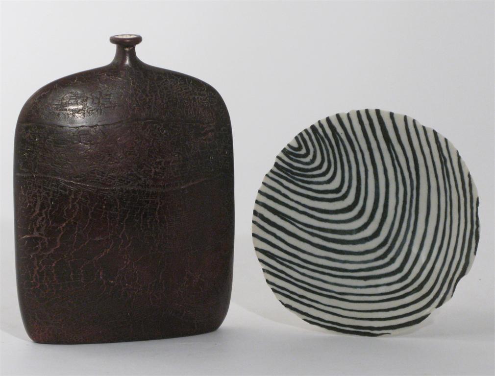 Peter Hayes (born 1946) a raku bottle vase, covered in a burnt umber glaze, and a Derek Davis stoneware dish incised signature, paper label 1985, repaired neck 20cm. high Provenance Peter Dingley Gallery, 1985, Peter Hayes vase