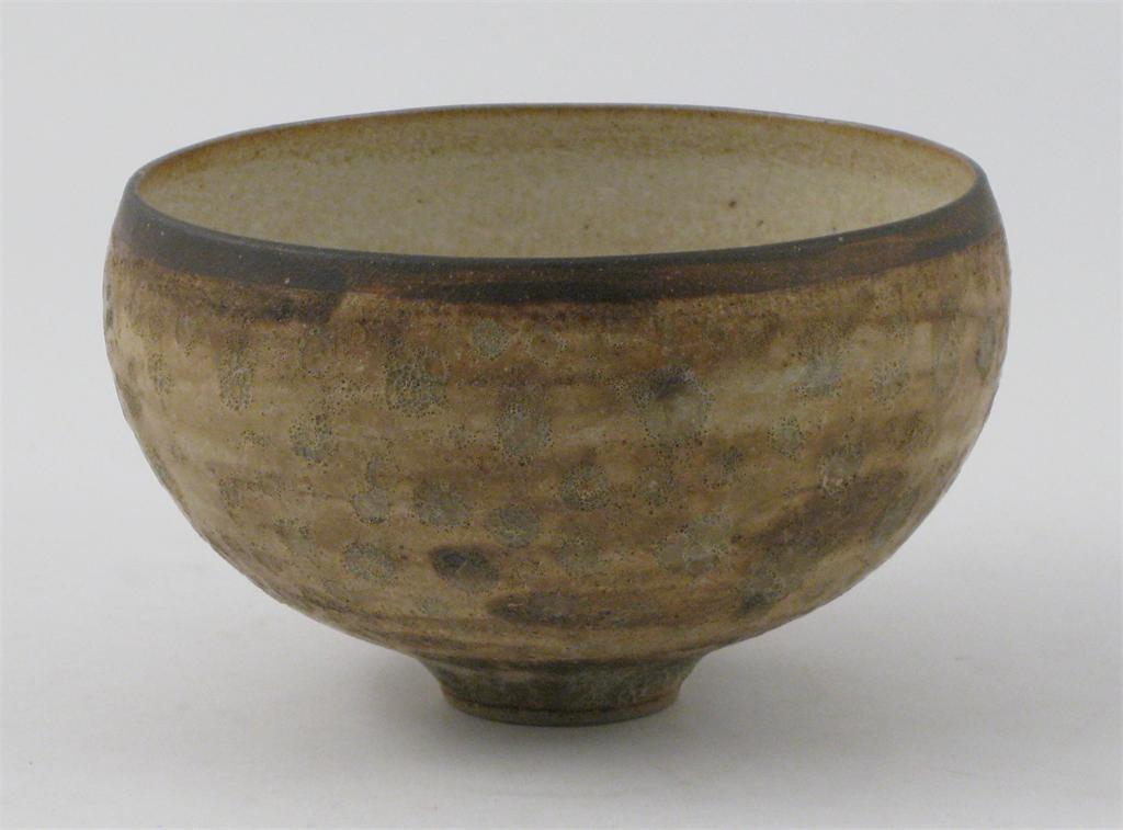 Deidre Burnett A stoneware footed bowl, covered in a volcanic glaze and bronzed rim impressed seal mark, small chips to inside top rim 17cm. diam.