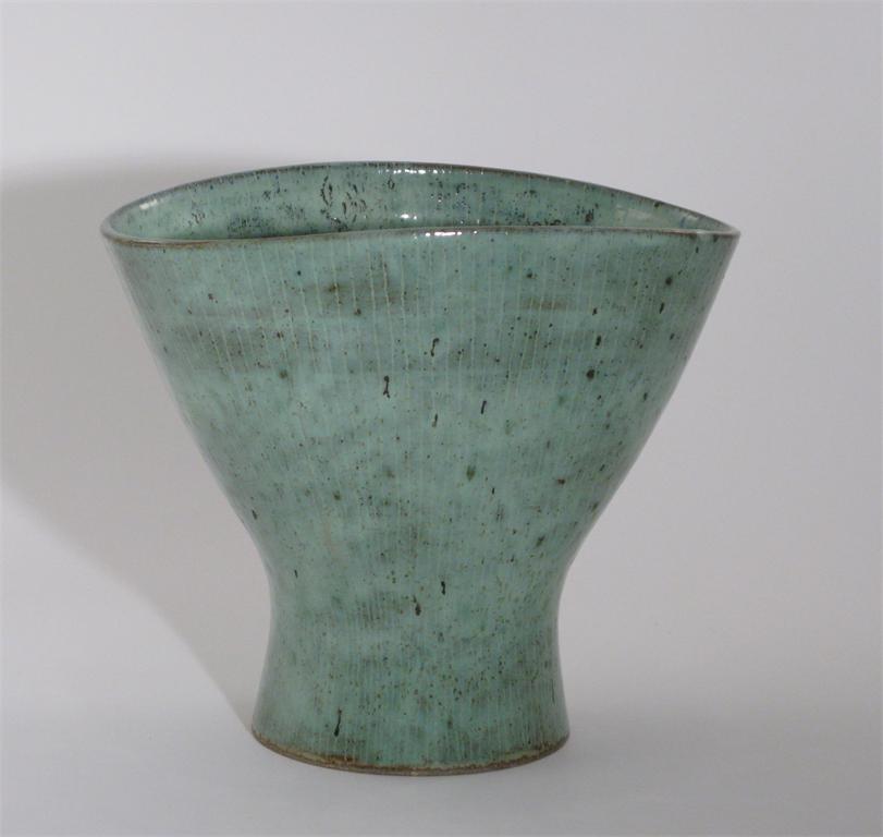 Lucie Rie (1902-1995) a large stoneware bowl, flaring form with vertical sgraffito lines, glazed speckled blue impressed seal mark 28 cm. high