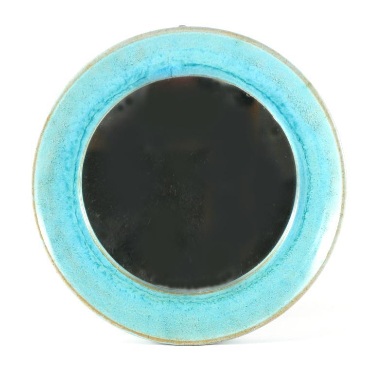 a rare stoneware wall mirror covered in a turquoise glaze impressed LR seal mark, circa 1940's 17.5 cm. diam.