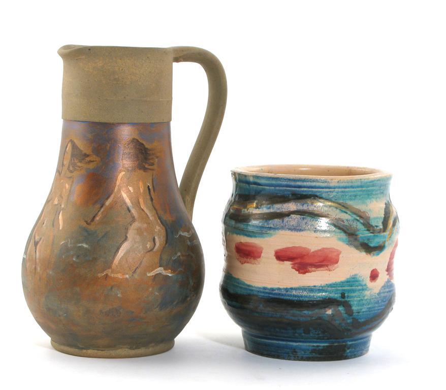 Quentin Bell (1910-1996) a Fulham Pottery vase, painted with geometric panels, and a Fulham Pottery Hurlingham Ware jug by S Cooper, painted with bathers impressed marks, impressed marks, painted signature 15cm. high
