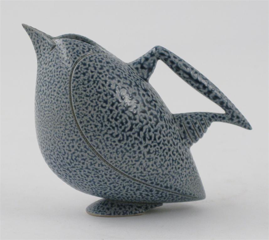 Anthony Theakston (born 1965) a salt glazed bird jug, glazed blue incised AT 11cm. high