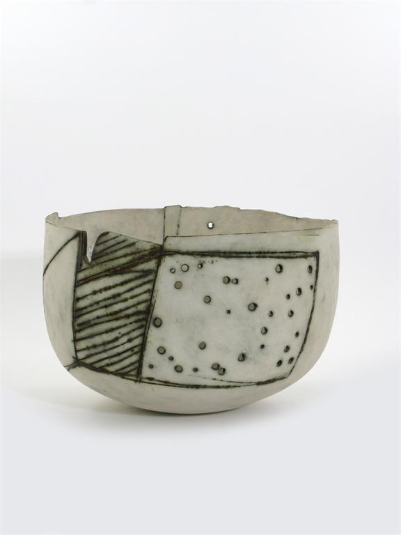 an earthenware coiled bowl, irregular form with pierced panels, painted white and brown painted GB signature dated 1986, minor restoration to rim 30.5cm. diam.
