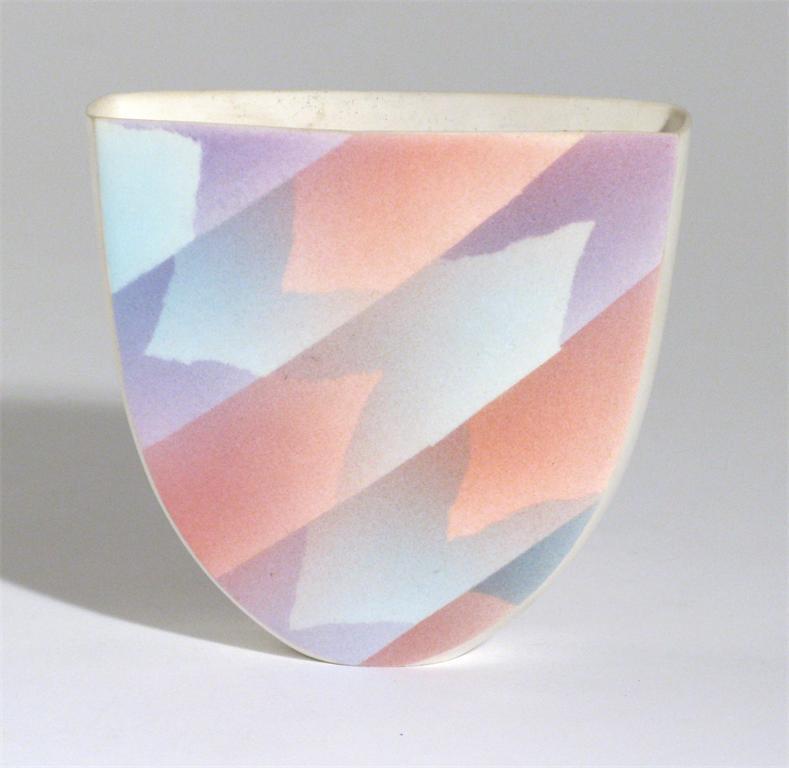 Sasha Wardell (born 1956) a porcelain vase, flattened form, spray glazed with geometric panels painted S R W monogram 9.5cm. high