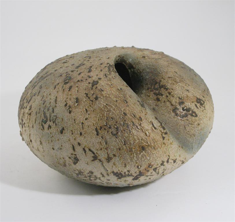 May Yeung a stoneware vase, organic conch form surface decorated impressed seal mark 32cm. diam.