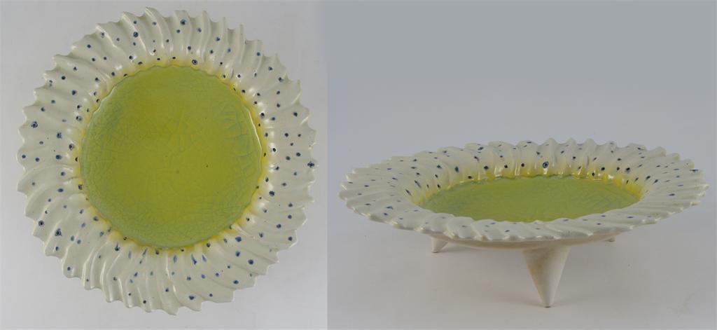 Richard Slee (born 1946) Sunflower, an earthenware dish on tripod foot, glazed incised Richard Slee, 34.5cm. diam.