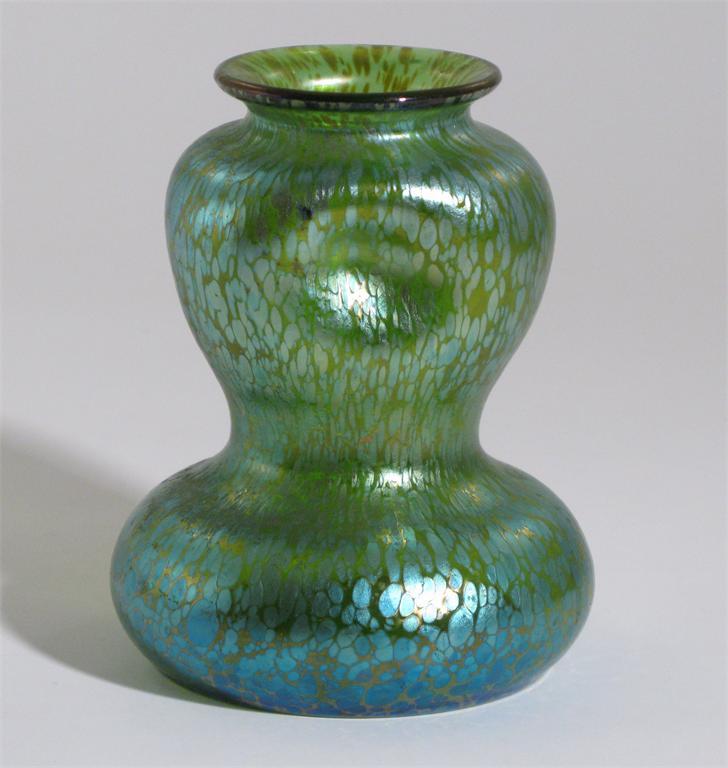 A Loetz glass vase compressed form with swollen dimpled neck and everted rim, covered in a green and blue splashed iridescence unsigned 16cm. high