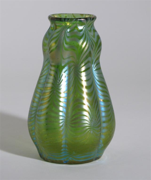A Loetz glass vase ribbed gourd form with everted rim, covered in a feathered iridescent glaze unsigned, small bruise to side 17cm. high