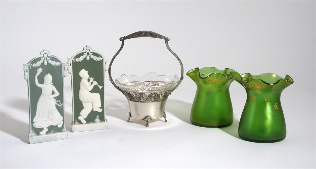A pair of Austrian Iridescent glass vases, decorated in gilt, a glass flower trough and three other items unmarked 10.5cm. high