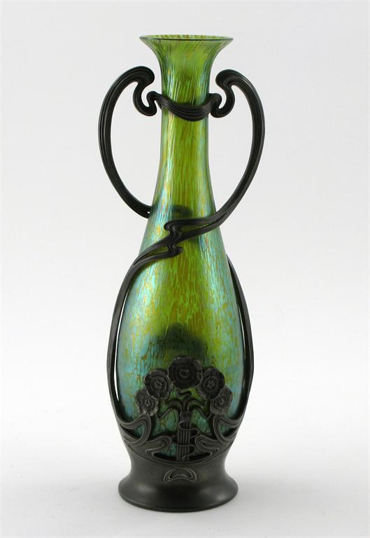 A pewter mounted Loetz glass vase the mount cast in relief with Art Nouveau flowers with scrolling handles, the glass with green and gold splashed iridescence unsigned 31.5cm. high