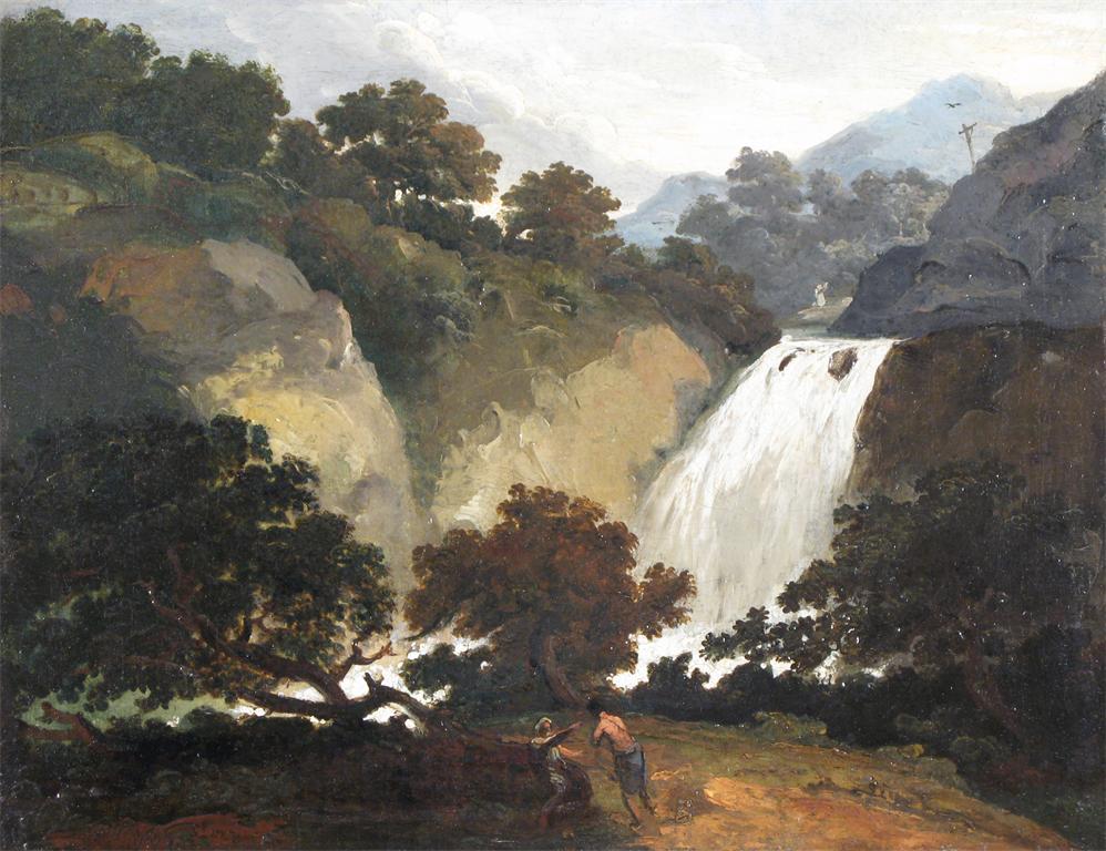 Attributed to Richard Wilson (1714-1782) Classical landscape with figures and a waterfall