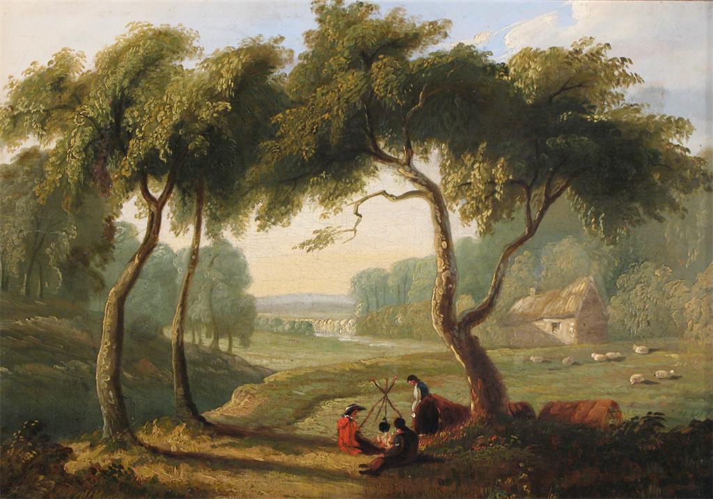 English School 19th Century Landscape with rustics by a fire Oil on canvas 27 x 40cm; 10½ x 15¾in