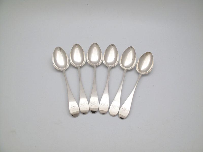 William Byres, a set of six silver old English Point pattern tablespoons, Aberdeen circa 1800, the terminals script engraved 'AJS', length 22cm, approx. weight 11oz. (6)
