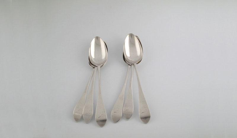 John Keith, a matched set of six silver old English point pattern tablespoons, Banff circa 1800, two sizes, script initialled 'J', length 22.9cm and 21.8cm, approx. weight 14oz. (6)