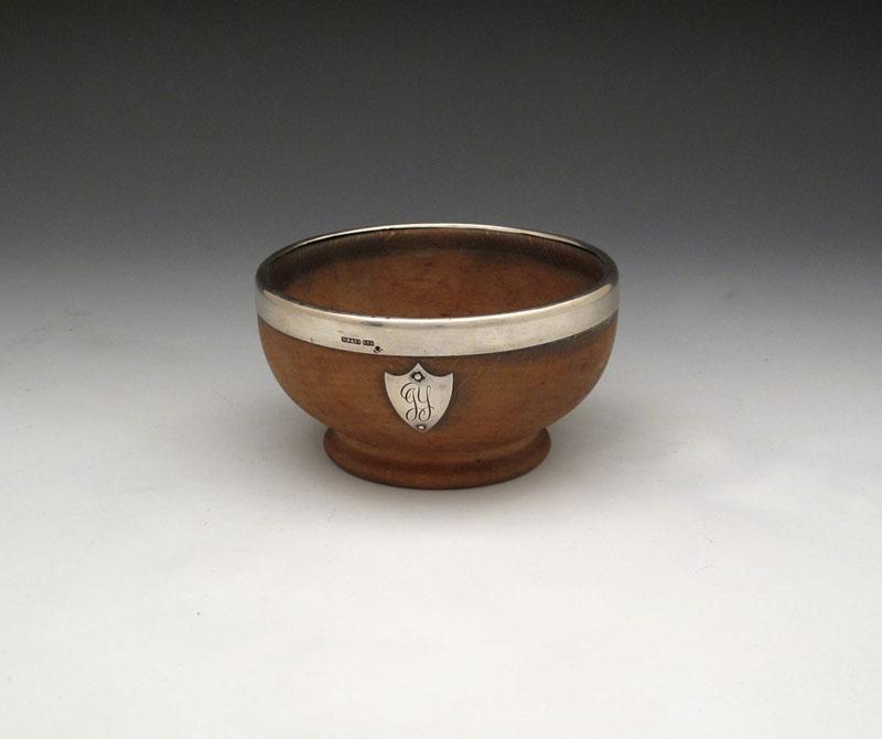 A Scottish provincial silver mounted mazer bowl, maker's mark of W. Dunningham, Aberdeen circa 1910, plain circular form, plain mount, with a initialled shield, diameter 11.5cm.