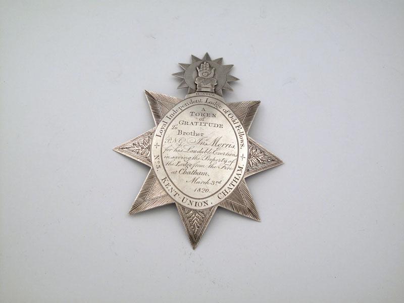 By Thomas Death, London 1820, star form, mounted with a star and hand pediment, inscribed, ' Loyal Independant Lodge of Odd fellows, No.3 Kent Union Chatham, A Token of Gratitude To Brother P.N.G. Jn.Morris for his laudable exertions in saving the property of the Lodge from the Fire at Chatham March 3rd 1820, length 16cm.