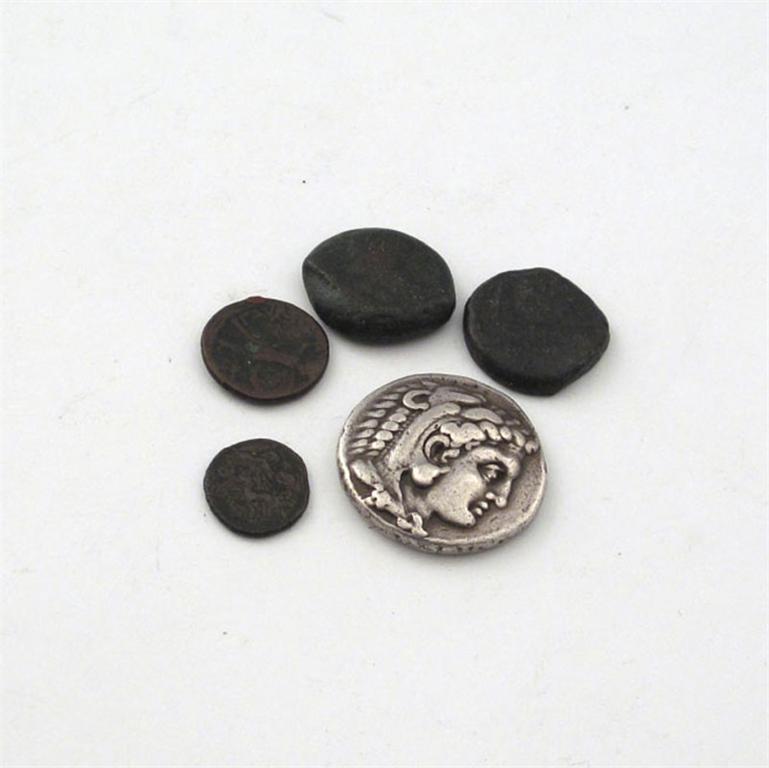 Ancient Greece, Macedon, Alexander III, The Great (336-323 B.C.), silver Tetradrachm, head of Alexander as Herakles right, wearing lion-skin, rev Zeus enthroned left, holding eagle and sceptre, (?) A below throne, 16.9gm (S 6713ff), fine; bronze coins (4), Gozo and Syracuse (3), poor. (5)