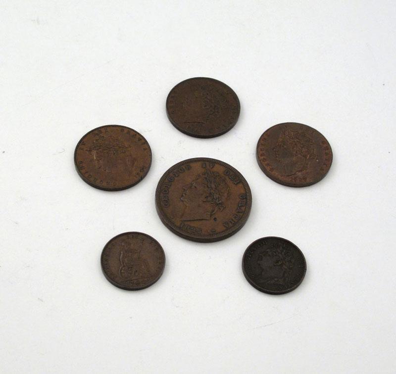 George IV, copper coinage with second bust, Penny, 1825; Halfpennies (3), 1825, 1827; Farthing, 1826, and 1st head, 1822 (S 3823; 3824, 3825, 3822). Last fine, one 1827 Halfpenny nearly extremely fine with some original colour, others very fine.