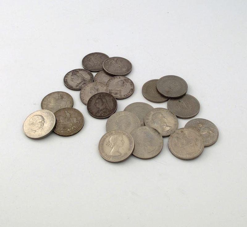 Victoria, silver coinage, Crowns (3), 1889, 1893, 1900; Double-Florins (4), 1887 (Arabic 1), 1889, mostly fine; with George V, Crowns (2), 1935, very fine; later Crowns of Elizabeth II (11), extremely fine or nearly so. (20)