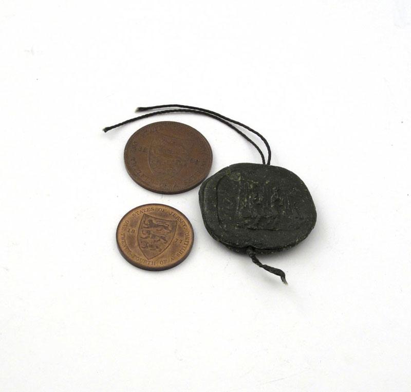 Jersey, Victoria, 1/24-Shilling, 1877 H (S 7007; KM 7), extremely fine with almost full lustre; Edward VII, 1/12-Shilling, 1909 (S7009), nearly extremely fine; and a small dark green wax seal, shield of arms / possible monogram, 40 x 35mmr), a curious survivor, fine. (3)