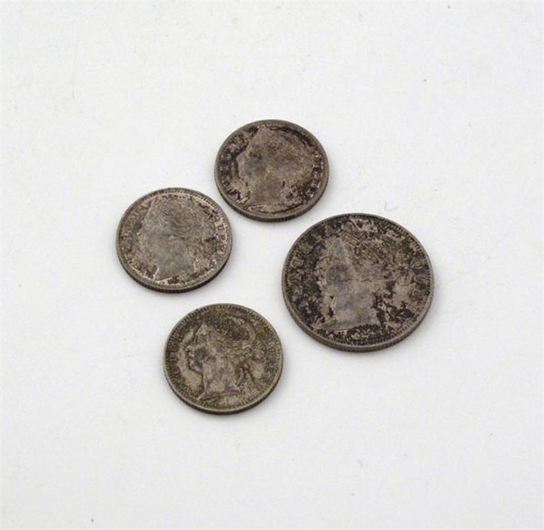 British Colonial coinage, Straits Settlements, Victoria, 20-Cents 1896; 10-Cents (3), 1896, 1898 (2) (KM 12, 11). Very fine and better, though partially stained. (4)