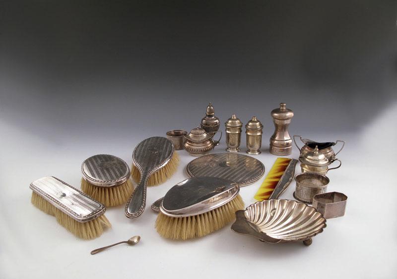 A mixed lot of silver items, various dates and makers, comprising: a modern pepper mill, a tea strainer and stand, a butter shell, a three piece condiment set, a dressing table set, a pair of military brushes, and other items. (qty)