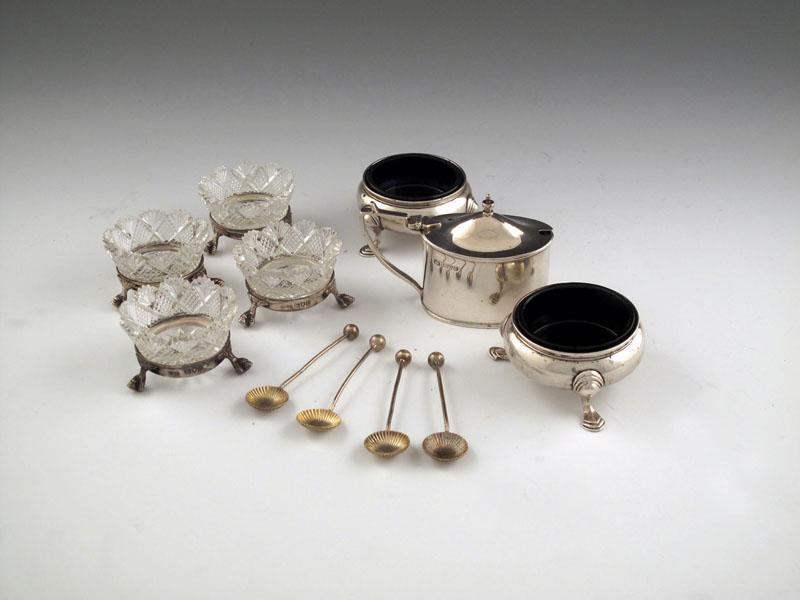 circular form, on three claw and ball feet, plus four unmarked spoons, a pair of George II silver salt cellars of cauldron form, London 1751 and a silver mustard pot, approx. weighable 5oz. (7)