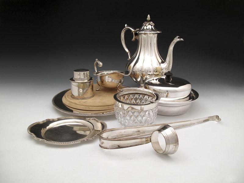 A mixed lot of electroplated items, comprising: a coffee pot of lobed baluster form, a bottle pourer, a tea canister, a bread board, a sauce boat and stand, a muffin dish and cover and a sugar basket. (qty)